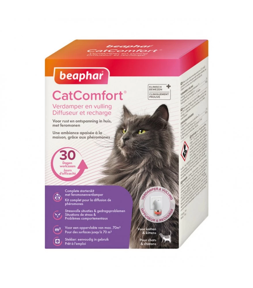 CatComfort van Beaphar maakt gebruik van feromonen. Hiervan is klinisch bewezen dat ze gevoelens van geruststelling bevorderen. Het vermindert zo de algemene angst veroorzaakt door stress rond het huis. Een kat kan zelf ook feromonen verspreiden. Dit doet hij als hij met zijn kop langs voorwerpen wrijft. Zo markeert de kat zijn territorium en ziet het als veilig en vertrouwd.