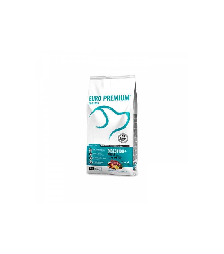 EURO PREMIUM DIGESTION+ Adult met verse eend draagt bij aan een optimale spijsvertering van je doggo. Dankzij het hypoallergeen recept zonder granen kunnen allergiegevoelige honden ook smullen zonder spijsverteringsproblemen.