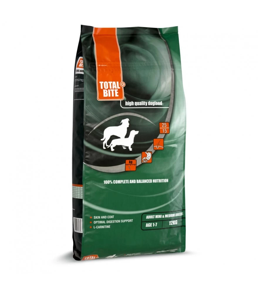 Dankzij het hoge gehalte van goed verteerbare dierlijke eiwitten afkomstig van pluim, vee en vis, en rijst, een bron van licht verteerbare koolhydraten, is de Total Bite Adult Mini & Medium Breeds voor volwassen honden (lichter dan 25 kilo) uiterst goed en licht verteerbaar.